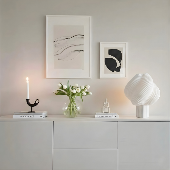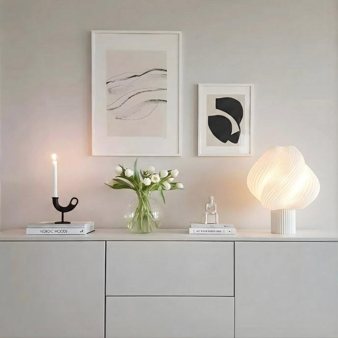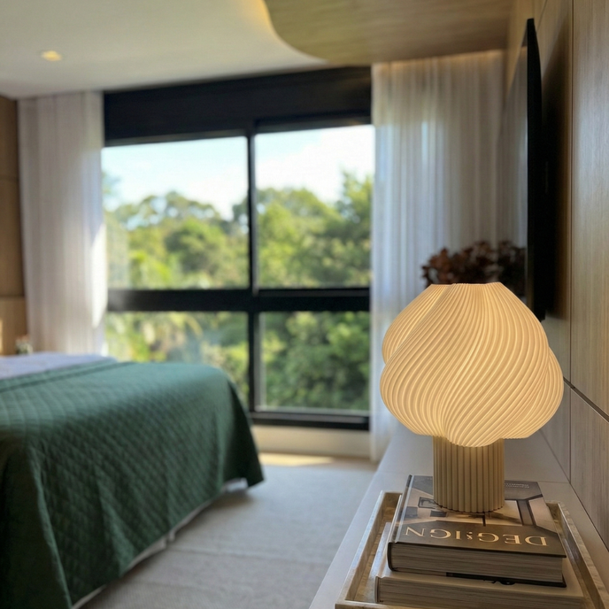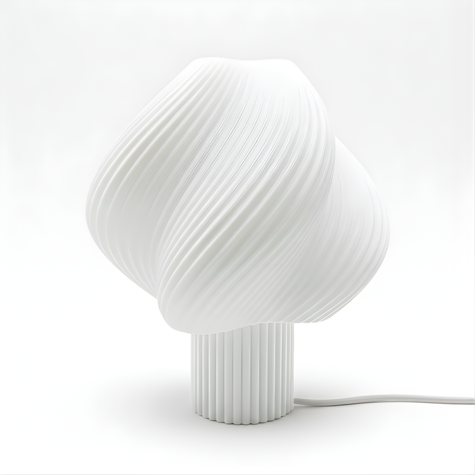 - Design organic & premium – formă fluidă, sculpturală, cu textură spiralată care difuzează lumina uniform; perfectă pentru interioare nordice, japandi, minimaliste sau naturale.