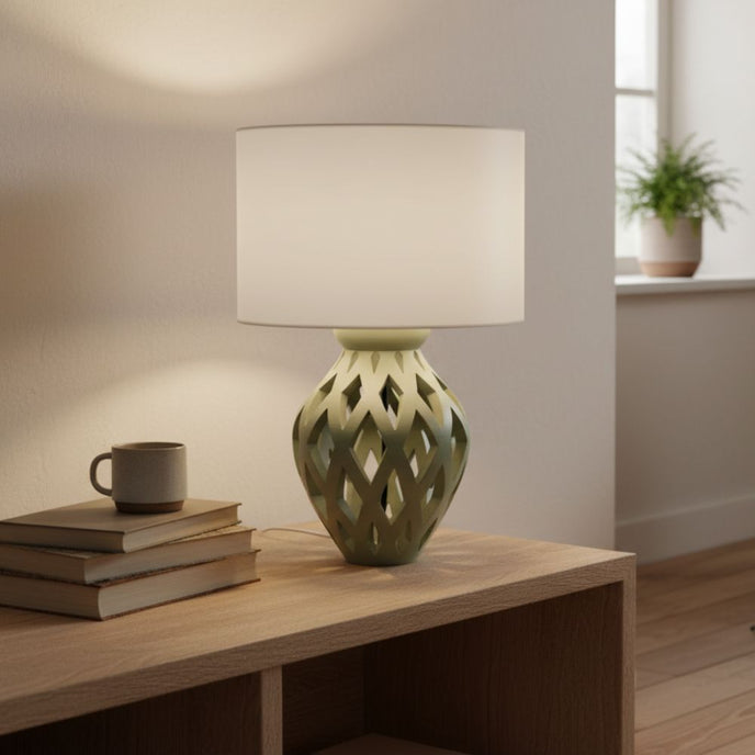 Oslo este o veioză decorativă premium, creată prin imprimare 3D și realizată dintr-un material ecologic obținut din plante (biopolimer pe bază de amidon de porumb). Baza sa sculpturală, cu textură spiralată, oferă un aspect modern și elegant, în timp ce abajurul cilindric alb completează perfect designul minimal și rafinat.