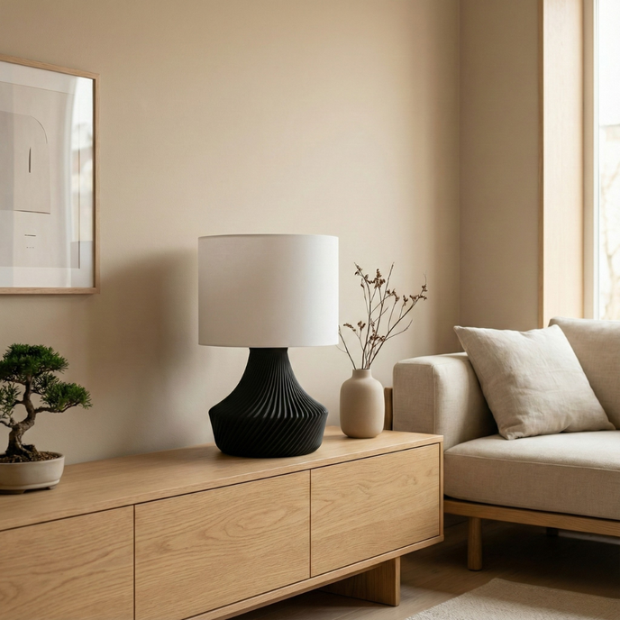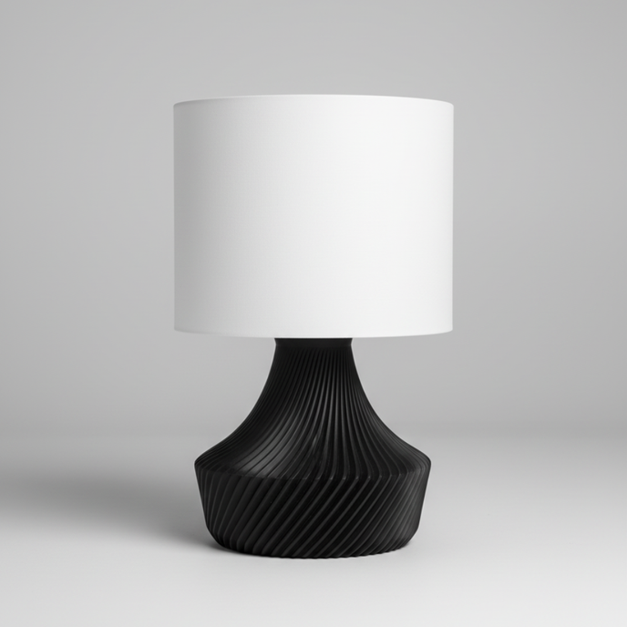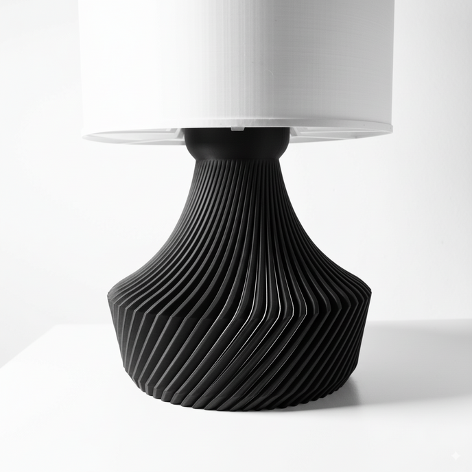 Zarin este o veioză decorativă premium, creată prin imprimare 3D și realizată dintr-un material ecologic obținut din plante (biopolimer pe bază de amidon de porumb). Baza sa sculpturală, cu textură spiralată, oferă un aspect modern și elegant, în timp ce abajurul cilindric alb completează perfect designul minimal și rafinat.